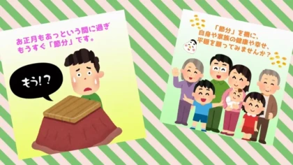 節分をテーマにイラストを制作頂きました☆ 今年の恵方は「東北東」です! 恵方巻は東北東を向いて食べましょう♪ 節分について調べたり、東北東は…