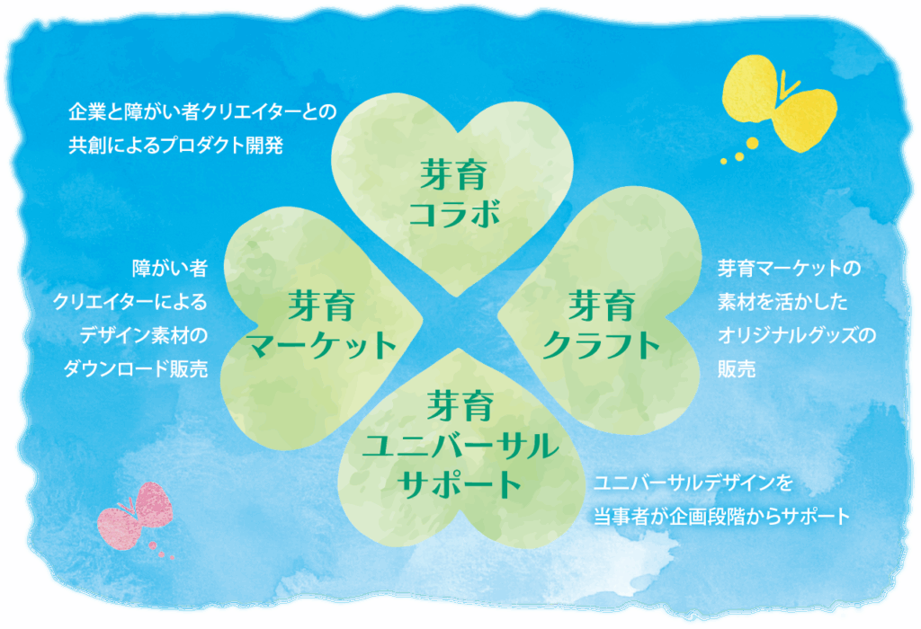「芽育(めいく)マーケット」は「芽育(めいく)プロジェクト」の一環です。本プロジェクトでは障がい者が持つ自由で豊かな発想から生み出されるクリエイティブな素材や作品をもとにビジネス展開を行い、素材としてダウンロード販売しています。 「芽育マーケット」のほか、企業と障がい者クリエイターの共創によるプロダクト開発「芽育コラボ」、芽育マーケットの素材を活かしたオリジナルグッズ販売「芽育クラフト」、ユニバーサルデザインを当事者が企画段階からサポートする「芽育ユニバーサルサポート」など4本の柱を元に活動しています。